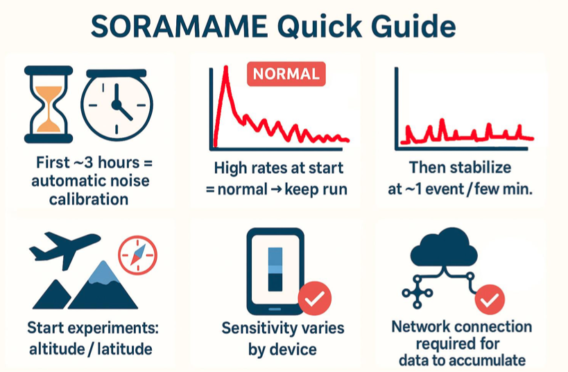Because Soramame allows cosmic ray detection without specialized equipment, it is highly suitable for educational use. Since detection relies on rare and spontaneous events, long-term observation is important. We encourage the use of unused smartphones or tablets to enable continuous data collection.